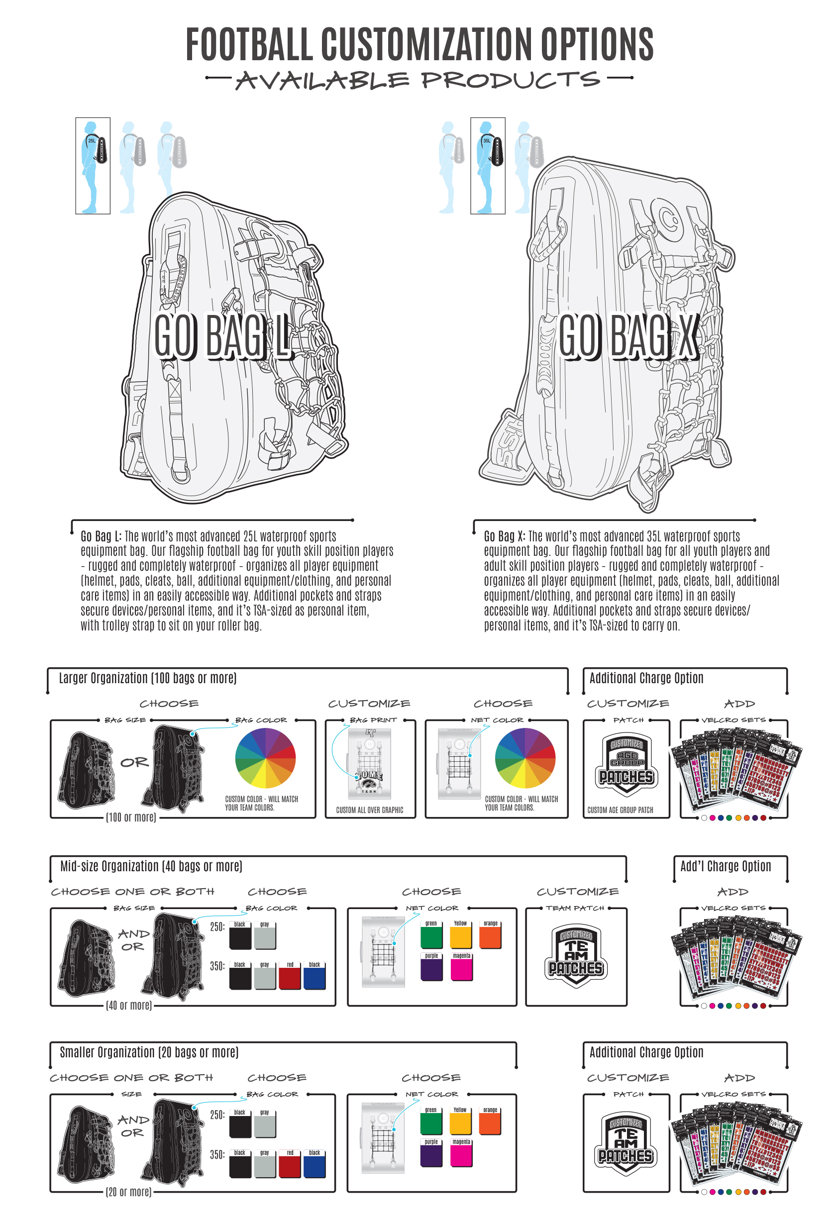 Go Bag X (35 liter): The world’s most advanced 35L waterproof sports equipment bag. Our flagship football bag for all youth players and adult skill position players – rugged and completely waterproof – organizes all player equipment (helmet, pads, cleats, ball, additional equipment/clothing, and personal care items) in an easily accessible way. Additional pockets and straps secure devices/personal items, and it’s TSA-sized to carry on.